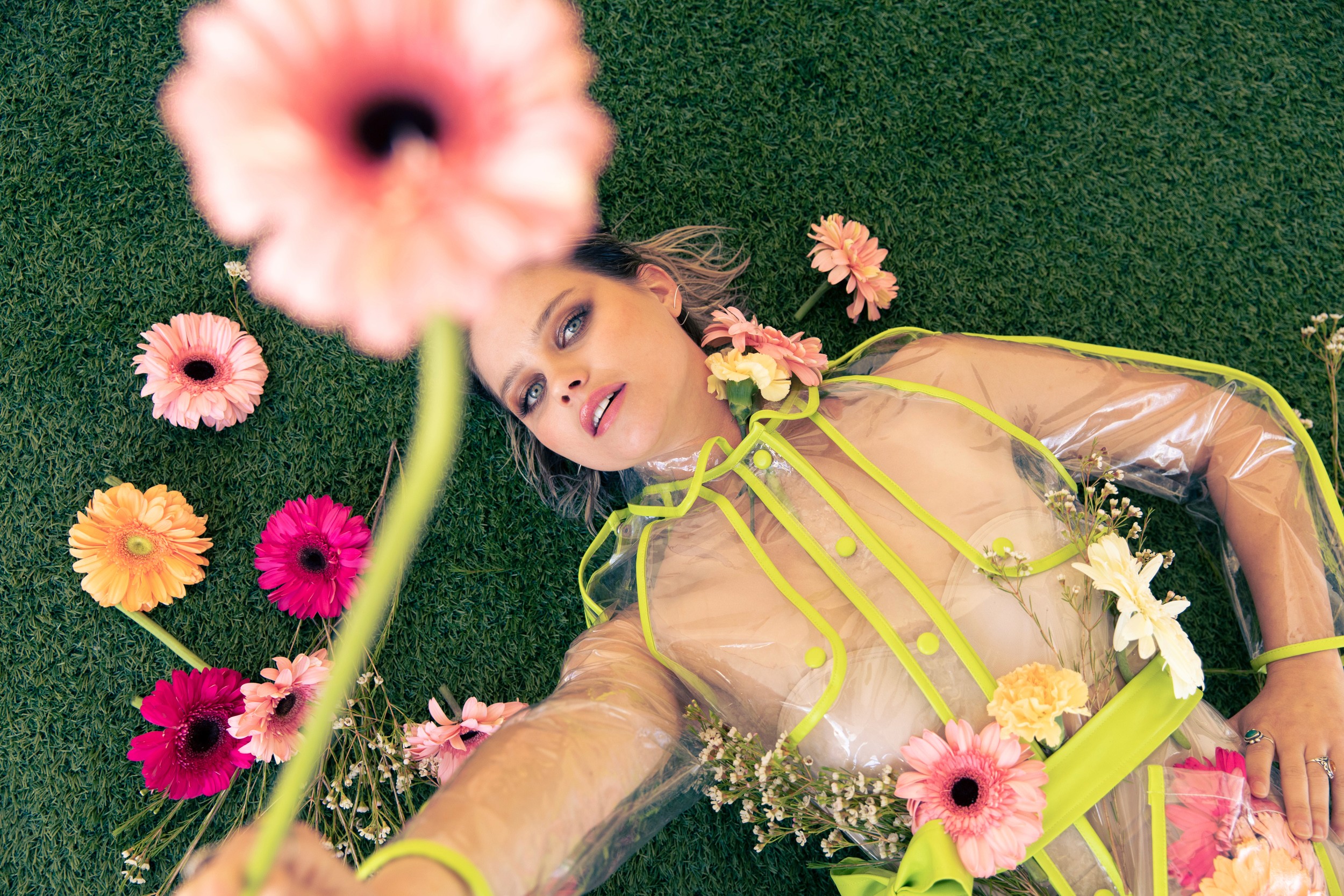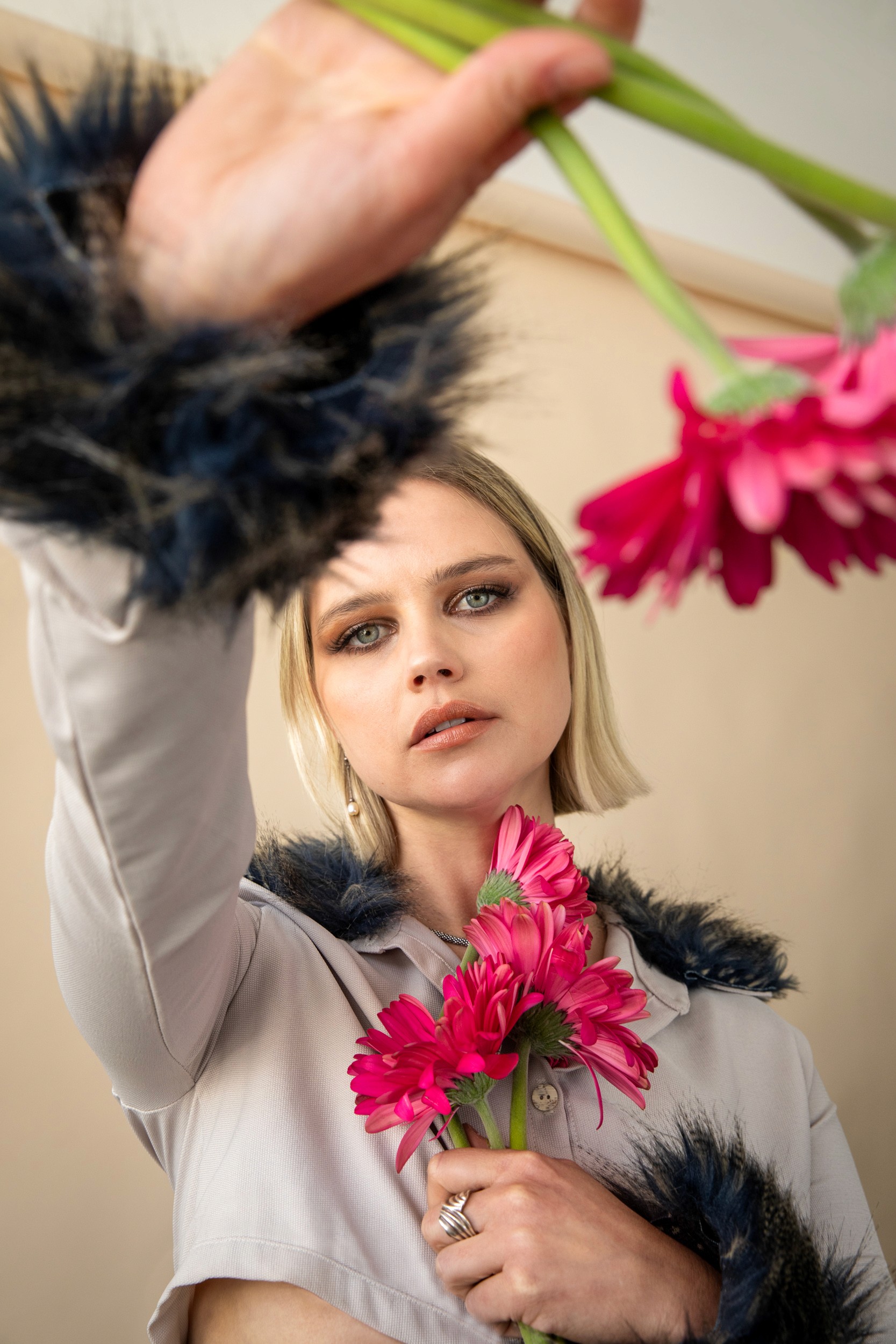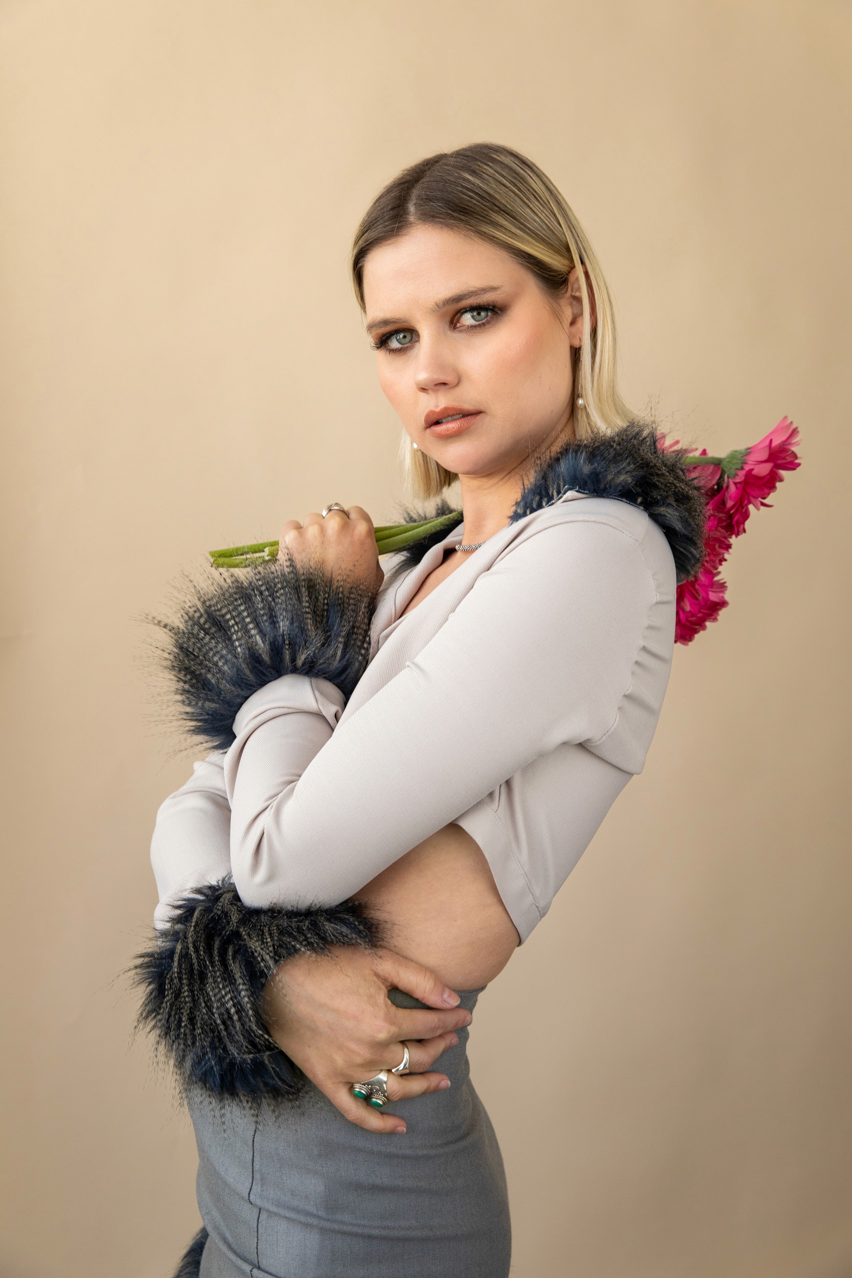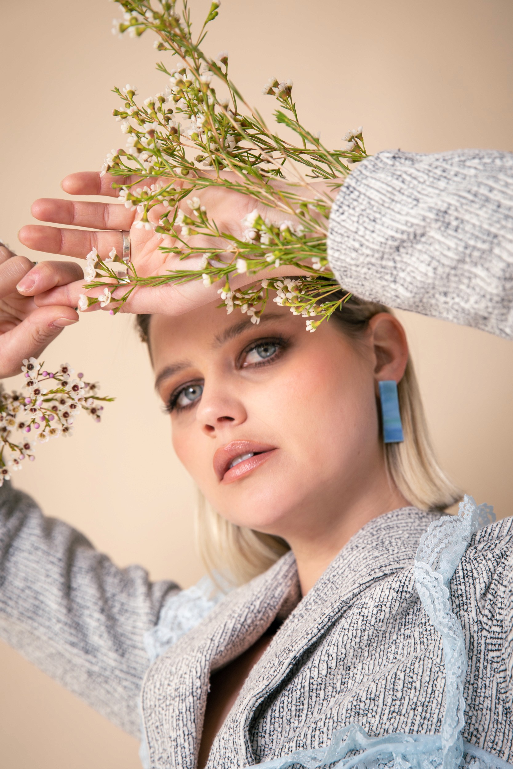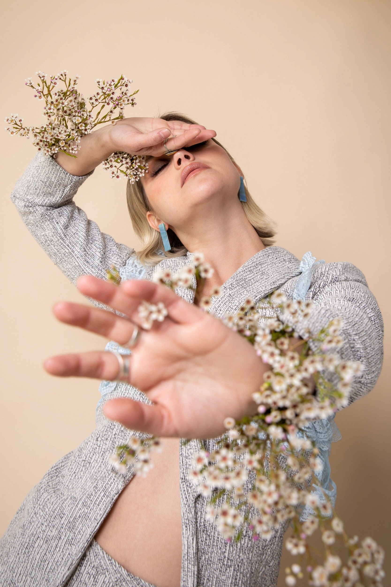The visual language combined soft lighting with a neutral backdrop to create a clean, airy tone. The compositions paired polished styling with organic gestures such as flowers held close, playful poses, and unexpected framing to bring personality and energy to the images. Every frame aimed to feel effortless, elevated, and alive.